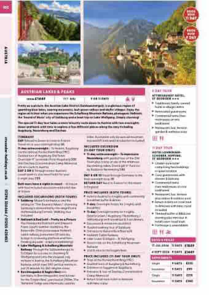 Pretty as a picture, the Austrian Lake District (Salzkammergut), is a glorious region of sparkling blue lakes, soaring mountains, lush green valleys and idyllic villages. Enjoy the region at its best when you experience the Schafberg Mountain Railway, photogenic Hallstatt, the ‘Sound of Music’ city of Salzburg and a boat trip on Lake Wolfgang. Simply stunning!