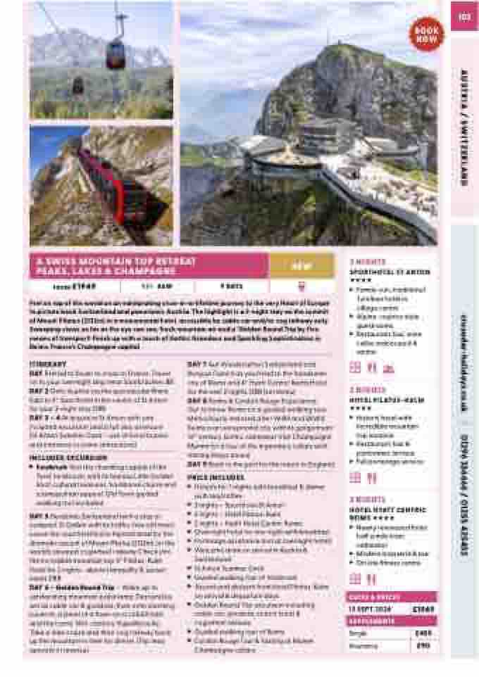 Feel on top of the world on an exhilarating once-in-a-lifetime journey to the very Heart of Europe to picture book Switzerland and panoramic Austria. The highlight is a 2-night stay on the summit of Mount Pilatus (2132m) in a monumental hotel, accessible by cable car and/or cog railway only. Sweeping views as far as the eye can see, fresh mountain air and a ‘Golden Round Trip by five means of transport! Finish up with a touch of Gothic Grandeur and Sparkling Sophistication in Reims, France’s Champagne capital
