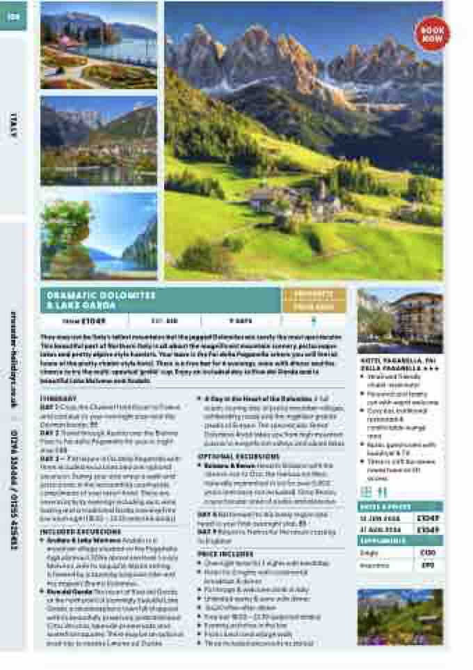 They may not be Italy’s tallest mountains but the jagged Dolomites are surely the most spectacular. This beautiful part of Northern Italy is all about the magnificent mountain scenery, picturesque lakes and pretty alpine style hamlets. Your base is the Fai della Paganella where you will feel at home at the pretty chalet-style hotel. There is a free bar for 6 evenings, wine with dinner and the chance to try the multi-spouted ‘grolla’ cup. Enjoy an included day to Riva del Garda and to beautiful Lake Molveno and Andalo