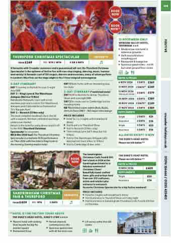 NB (6 Nov 2026 tour) The Thursford Christmas Spectacular is a matinee 14:00 performance on 7 Nov 2026 with free time in King’s Lynn in the morning. Evening meal in hotel