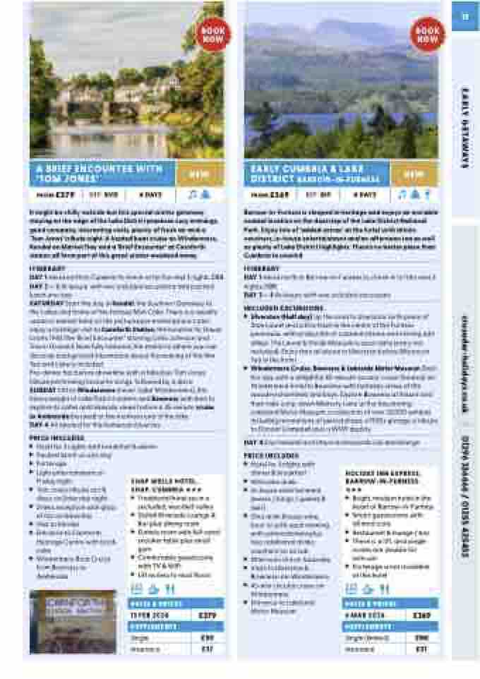 DAY 1 Head north to Cumbria to check-in for the next 3 nights. DBB DAY 2 – 3 At leisure with two included excursions and packed lunch one day