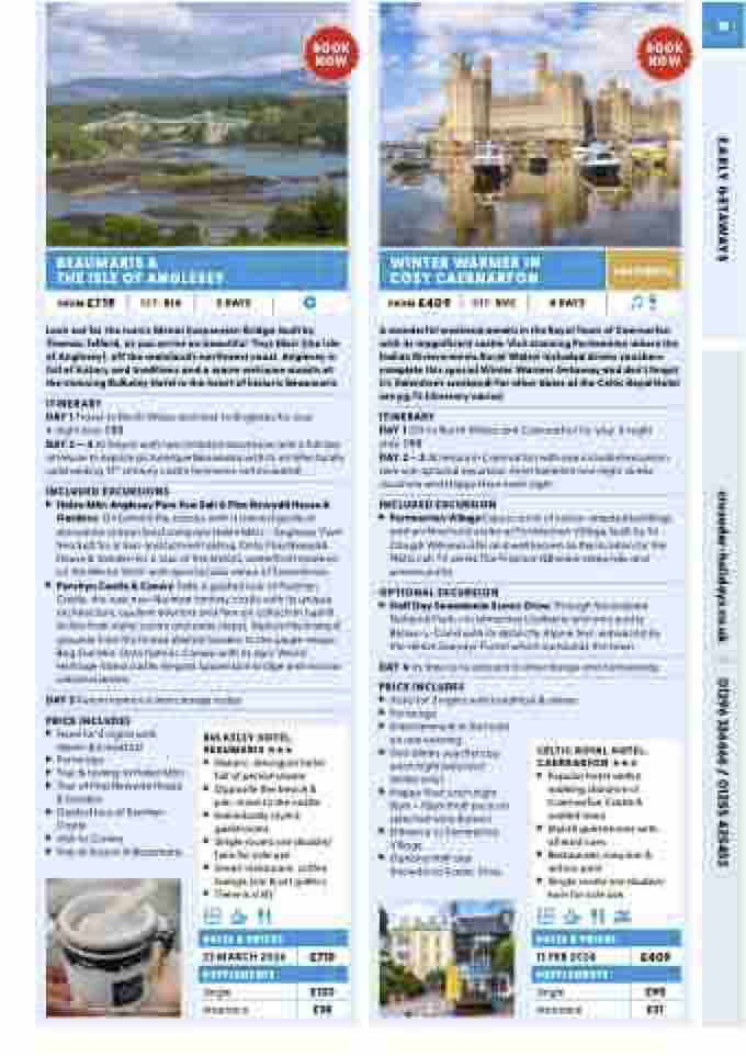 A wonderful weekend awaits in the Royal Town of Caernarfon with its magnificent castle. Visit stunning Portmeirion where the Italian Riviera meets Rural Wales! Included drinks vouchers complete this special Winter Warmer Getaway and don’t forget it’s Valentine’s weekend! For other dates at the Celtic Royal Hotel see pg 75 (itinerary varies)