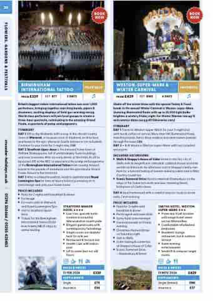 Shake off the winter blues with this special Turkey & Tinsel break to the annual Winter Carnival in Weston-super-Mare. Stunning illuminated floats with up to 25,000 light bulbs brighten a wintery Friday night. For Winter Warmer see pg 15 and summer dates see pg 40 (itineraries vary)