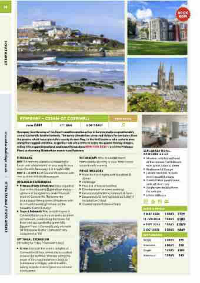 DAY 1 A morning departure, stopping for lunch and refreshments on your way to your resort hotel in Newquay. 4 or 6 nights DBB DAY 2 – 4 (OR 6) At leisure in Newquay with two or three included excursions