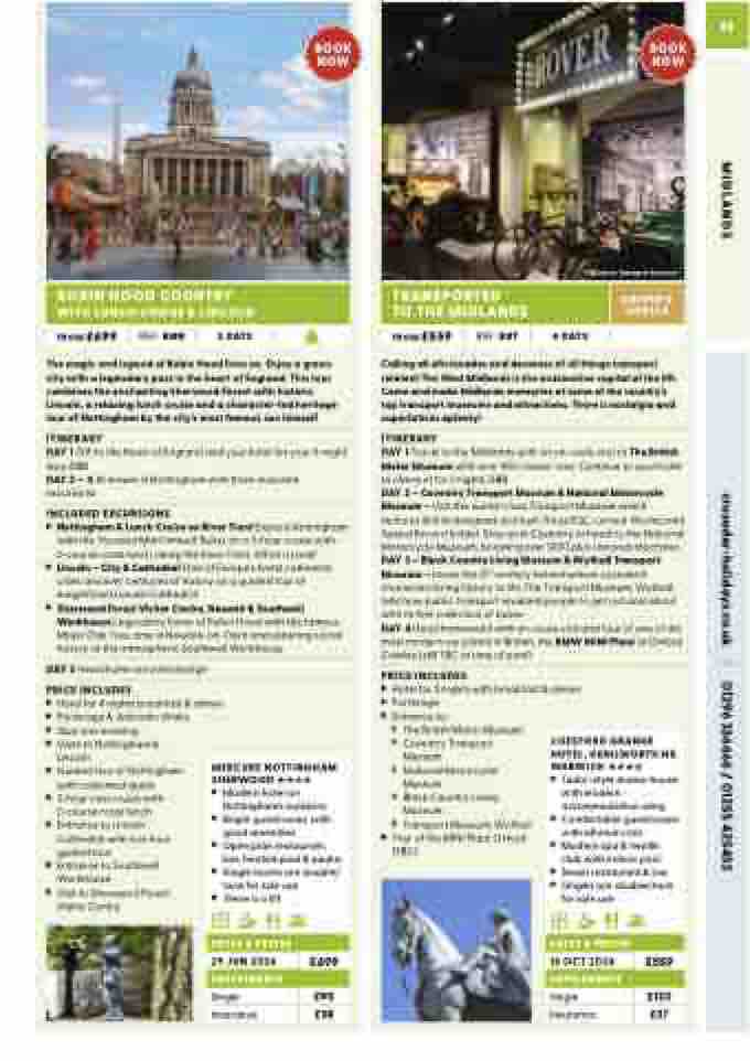DAY 2 – Coventry Transport Museum & National Motorcycle Museum – Visit the world-class Transport Museum which features British designed and built ThrustSSC, current World Land Speed Record holder. Stay on in Coventry or head to the National Motorcycle Museum, boasting over 1000 plus restored machines DAY 3 – Black Country Living Museum & Wythall Transport Museum – Leave the 21st century behind where costumed characters bring history to life. The Transport Museum, Wythall tells how public transport enabled people to get out and about with its fine collection of buses