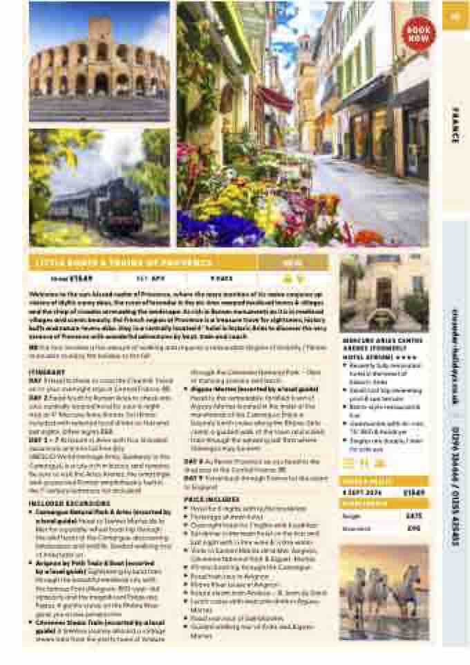 DAY 1 Head to Dover to cross the Channel. Travel on to your overnight stop in Central France. BB DAY 2 Head South to Roman Arles to check into your centrally located hotel for your 6-night stay at 4* Mercure Arles Arenes. Set dinner included with selected local drinks on first and last nights. Other nights B&B