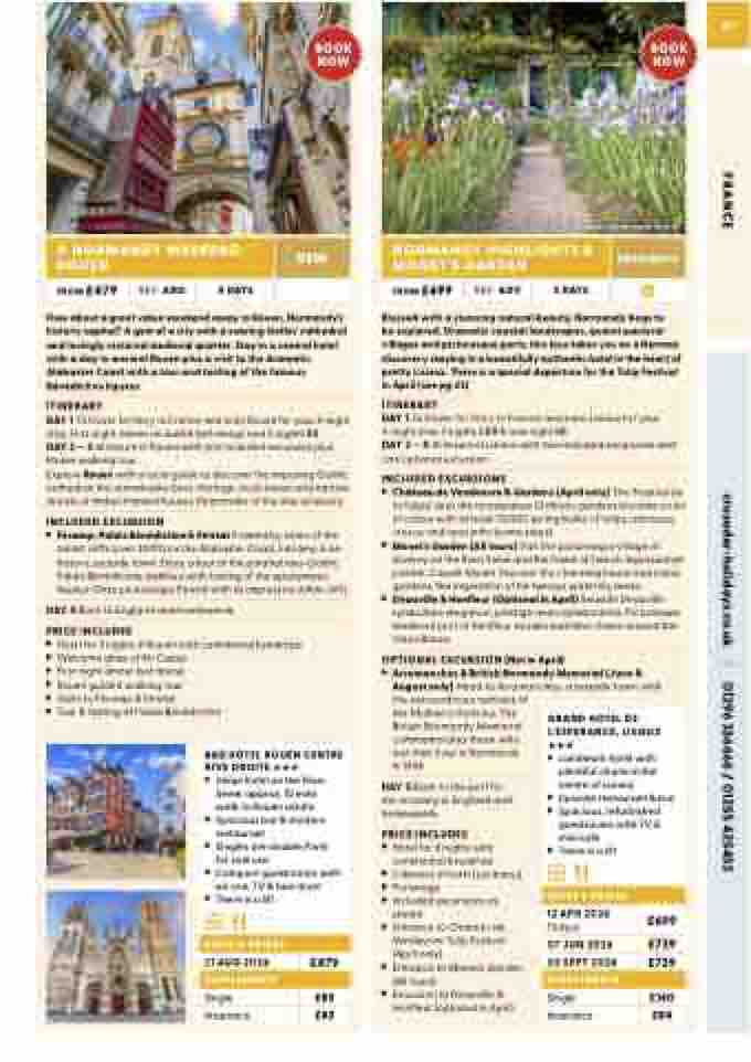 be explored. Dramatic coastal landscapes, quaint pastoral villages and picturesque ports, this tour takes you on a Norman discovery staying in a beautifully authentic hotel in the heart of pretty Lisieux. There is a special departure for the Tulip Festival in April (see pg 23)